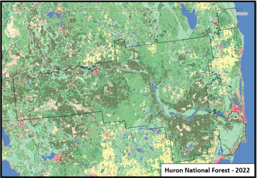 Remote sensing is the detection and monitoring of physical characteristics on the earth by measuring reflected light and energy within the electromagnetic spectrum from a distance, typically from a satellite in outer space, aircraft, or drone (USGS). This is an interactive StoryMap that explores how remote sensing is used to monitor Michigan’s forests landcover change, fire hazards, invasive species, and more.